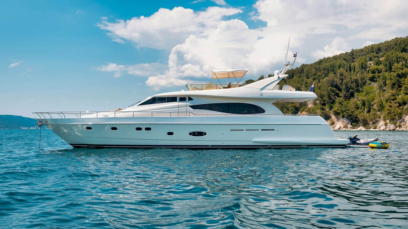 The luxury motor yacht 'Marino' was built by Ferretti, she known for its sleek layout and powerful performance with top speeds of 33 knots and cruising speed of 26 knots. Four guests en suite cabins and ample common spaces, make her an ideal choice for families, honeymooners and groups of friends looking to spend some quality vacation time together. She will be managed by the crew of 3 including the captain. The crew will ensure you have a relaxed and enjoyable charter experience with all of your needs catered for while on board. 'Marino' features airy and comfortable interiors, with clean lines and sensible decoration, allowing you and your guests to add your personal touch. The Grand Saloon with top-notch AV system will surely host some down-time, and the stern dining area some memorable starlight dinners. The 'Marino' flybridge remains her ultimate chilling spot. Accessible from both the stern and the saloon, this is the place to sun pads, soak in the Adriatic beauty or to reconvene over a barbecue or with a glass of wine around the snowy-white seating set.