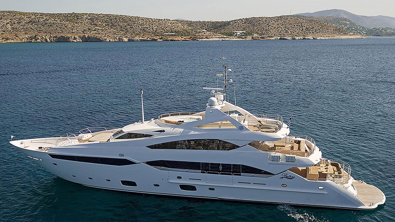 'Pathos' is a modern, stylish 131’ Sunseeker, timeless in design, craftsmanship, and in immaculate condition, maintained by a professional crew all year-round at the highest of standards. The beautifully appointed layout includes 6 luxurious and spacious staterooms accommodating up to 12 guests offering the utmost comfort. Perfect for couples, she sleeps 6 couples cruising with a choice of two master suites (one on the main deck, the other on the upper deck), two double staterooms, and two flexible twin staterooms which, on request, can be converted to doubles, or to triple staterooms as they each have a third pullman berth. The upper deck Master Suite comes with its own private sauna, walk-in closet, and balcony doors opening to breathtaking views. The special feature of fold-down hydraulic balconies which open in the main salon creates an airy and luminous ambiance, perfect for socializing with family and friends and dining alfresco under the stars! Relax and soak in the rays whilst sunbathing on the sunbeds and enjoy the best summer moments, with the finest scenic views in the Jacuzzi. A quintessential choice for your holiday!
