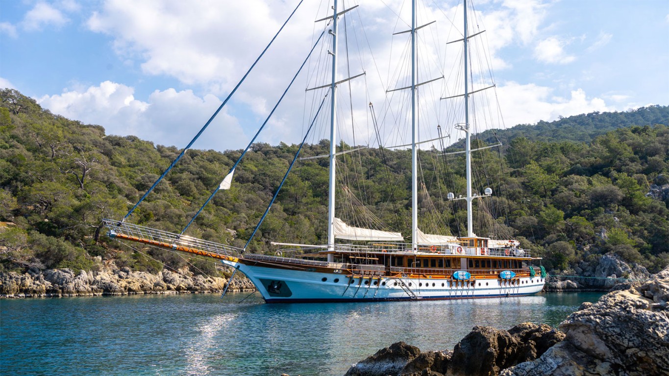 The 47m luxury gulet 'Admiral' is a traditional Turkish custom-built from wood and offering unprecedented charter experience in the Eastern Mediterranean. She is a particularly large vessel that can accommodate a group of 36 guests over 16 cabins. The cabins comprise 10 double cabins, 4 triple cabins and 2 twin cabins. Each cabin comes with its own bathroom and air conditioning. She is also capable of carrying up to 7 crew onboard to ensure a relaxed luxury yacht charter experience. The exterior deck areas include a spacious foredeck with an al fresco dining set up for guests to enjoy, as well as a lounging area. On the upper deck, there is plenty of space to sunbathe and enjoy the sunshine or read a book. The interior offers an inviting saloon with a dining area that includes dining tables with c-shaped sofas and chairs, as well as a bar.