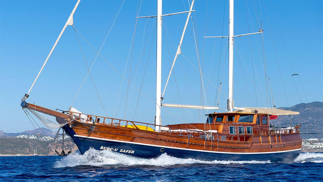 'Burc-u Zafer’s interior layout sleeps up to 12 charter guests in 6 comfortable cabins as 2 Double and 4 Twin cabins of which 2 of them can convert into doubles on request. All cabins are with en suite bathrooms. She is also capable of carrying up to 5 crew members onboard to ensure a relaxed gullet cruise experience. There are both spacious seating areas at the front and aft deck. A large sunbathing area with mattresses for the whole group is at front. There are dining table at the aft deck as well as in the saloon for the guest’s prefer. 27 meters long gullet yacht built in 2000 and was refitted in 2010. The gulet with its fully equipped navigation equipment, water toys, and galley offers unique blue cruises along the Turkish Riviera.