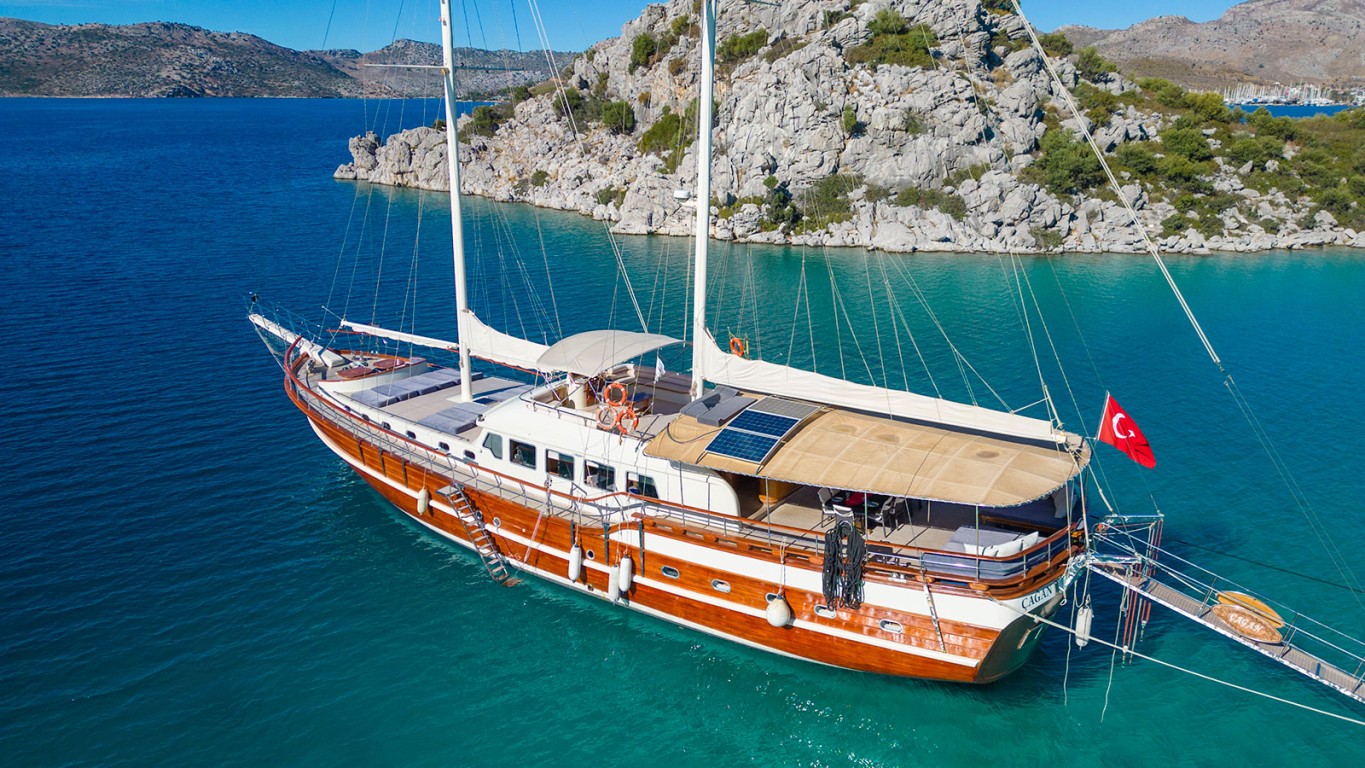 Gulet 'Cagan', 32 meters in length and can comfortably accommodate up to 12 guests, in her well equipped 6 cabins. She accommodated in 2 master, 2 double and 2 twin with one double bed and one single. Each cabin is equipped with air conditioning and en-suites. All cabins air are conditioned. Gulet 'Cagan' has all the classic outdoor spaces suitable for the real-life on a gulet charter, relaxing and enjoying the sun while being served delicious meals, and being attended by a professional and friendly crew. She has tastefully designed saloon with dining area, bar area and TV corner and comfortable sun mattresses on the front deck- a wide beam of 8 meters.