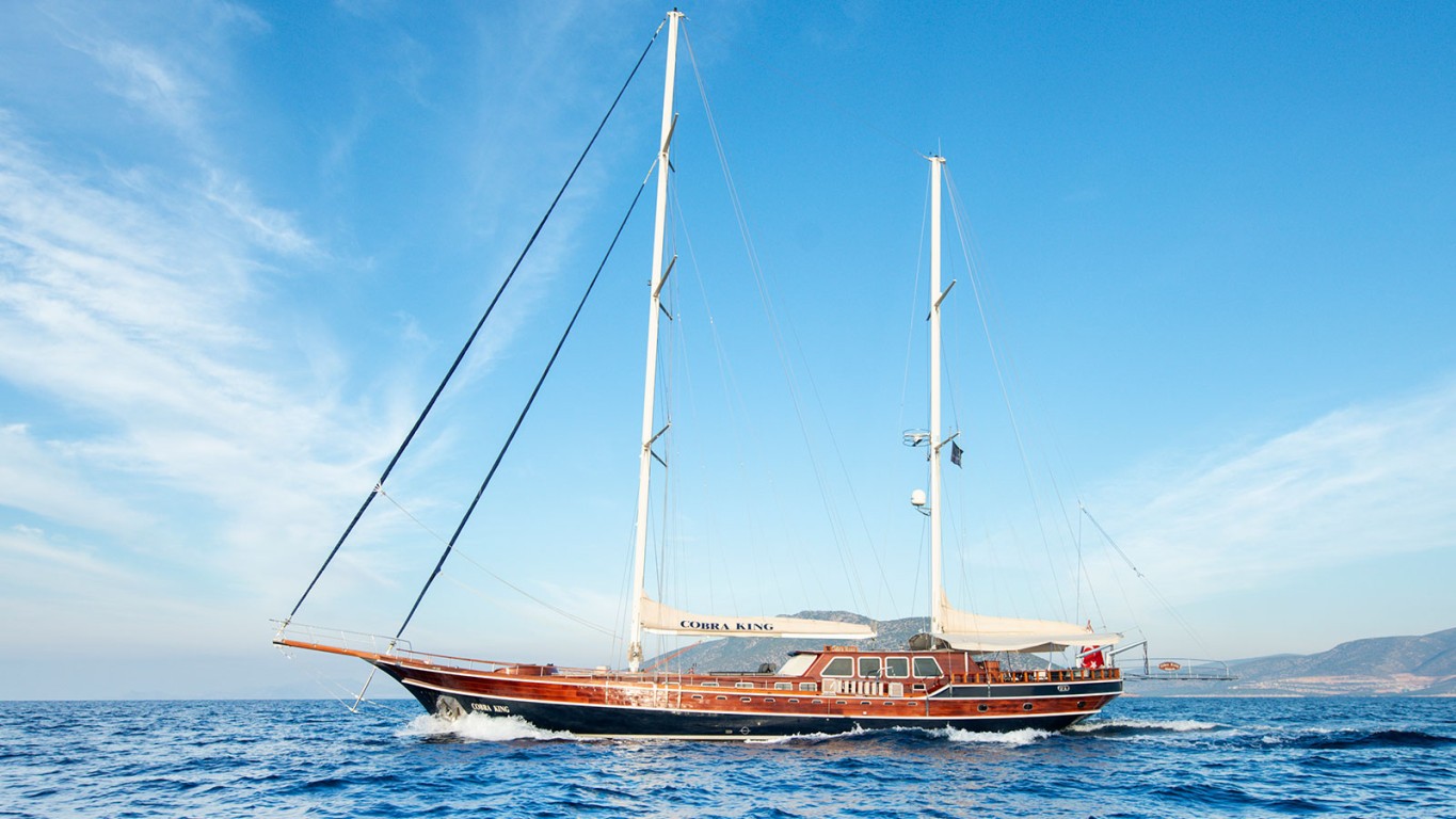 Built in 2005 by Cobra Yacht, the hull of the 'Cobra King' is constructed with laminated mahogany and it is a luxurious yacht with an oak frame that sails on the seas like a work of art with its 38.60 metre length and 8 metre beam and deck built from teak. The 5 cabins in the 'Cobra King' comprise of 1 master, 2 double and 2 twin cabins and offer comfortable accommodation to 12 people. All cabins have a LCD TV, DVD player, air-conditioner and spacious bathrooms laid with marble. 'Cobra King' has a crew of 6 professionals offering high quality service in order to serve maximum guest satisfaction. Offering an unforgettable blue cruise experience to its passengers on the Aegean and Mediterranean coast, the captivating 'Cobra King' is furnished with the comfort of a floating hotel.