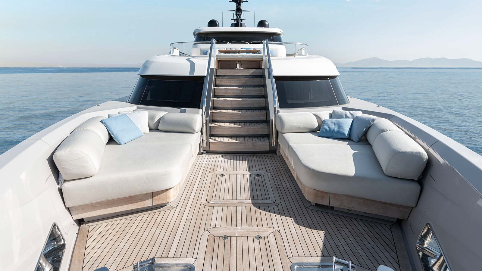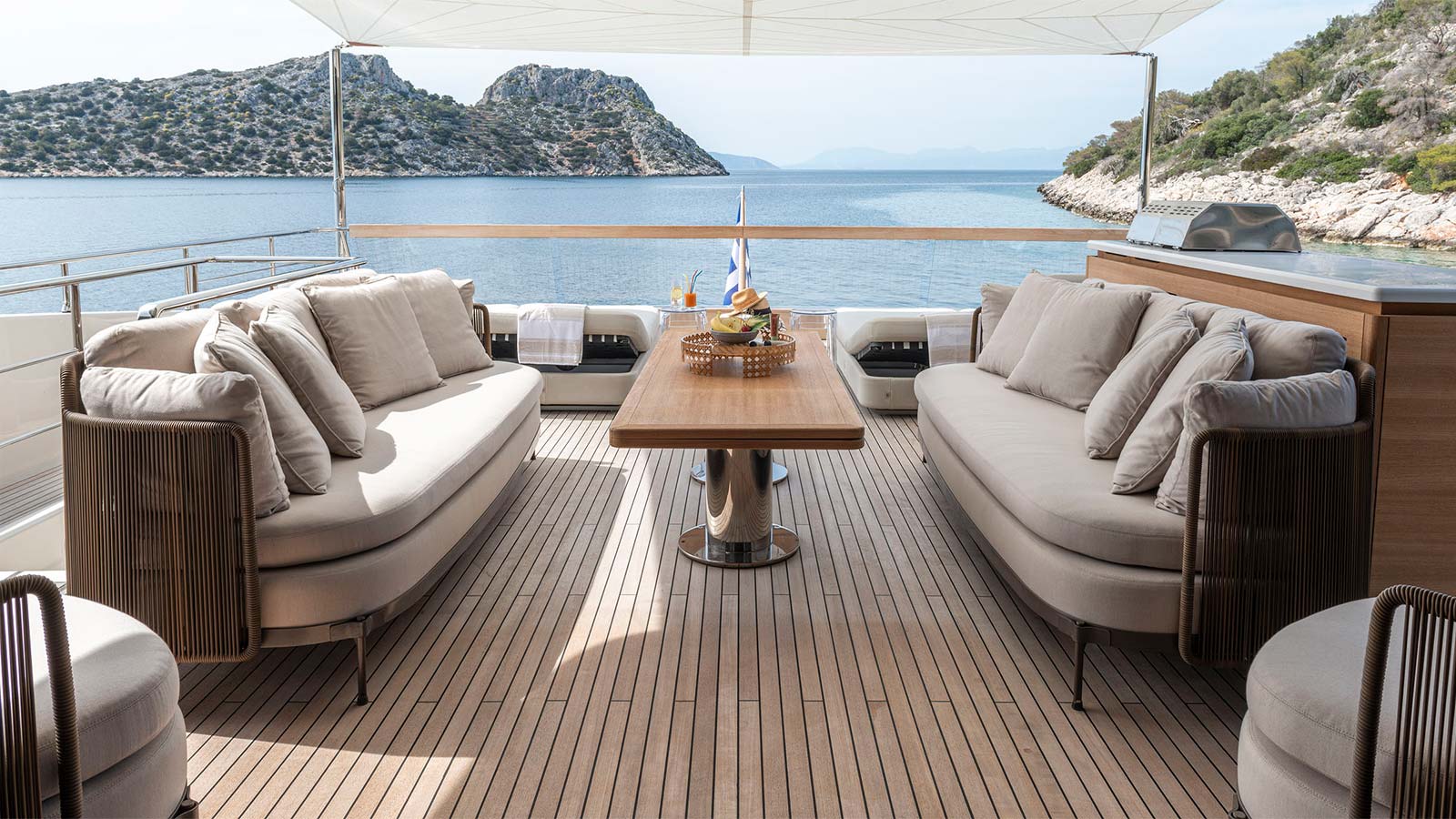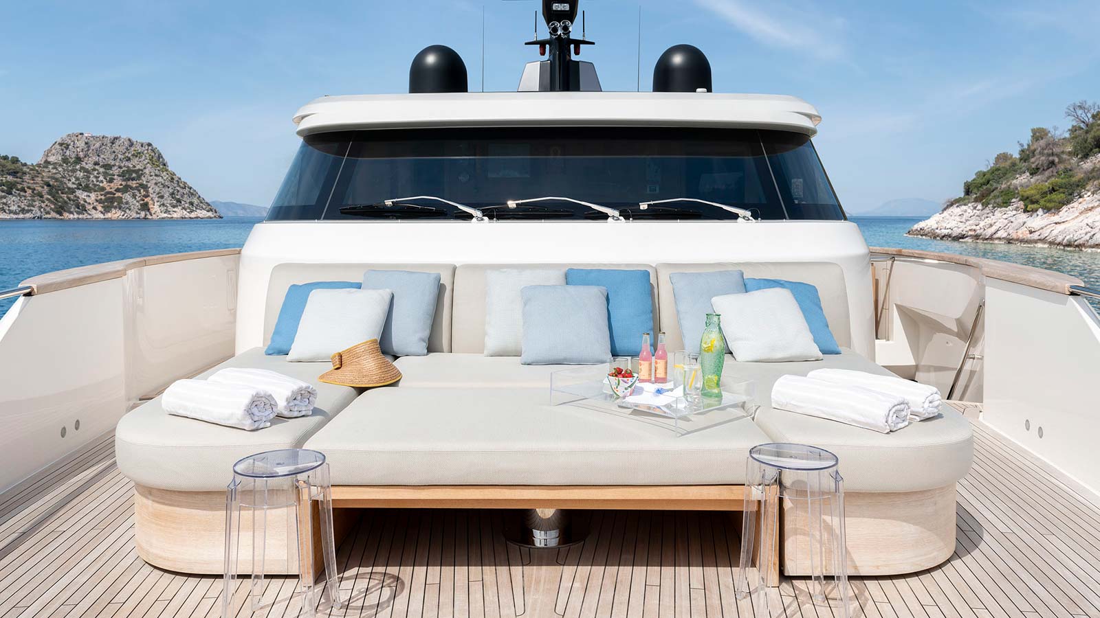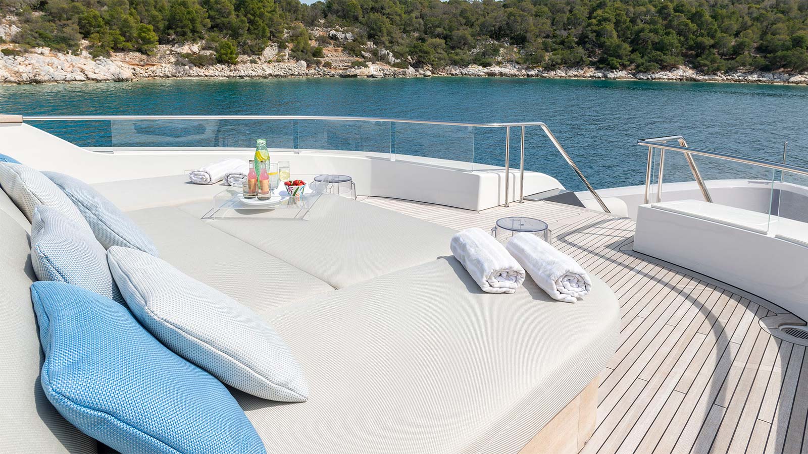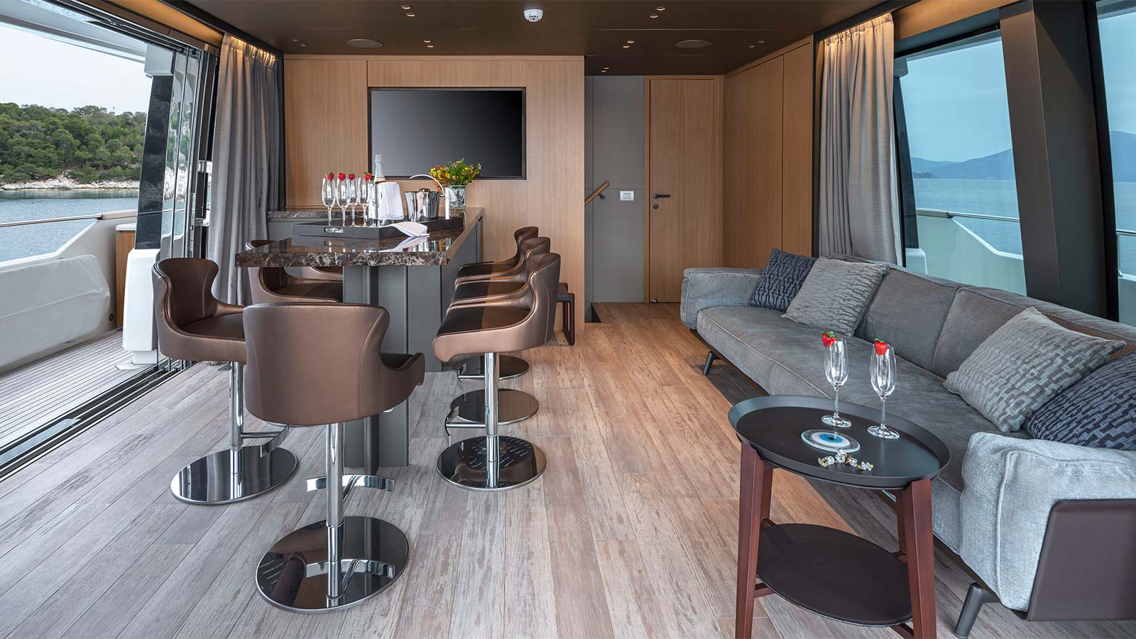 'Fatsa' by the Italian shipyard Sanlorenzo offers flexible accommodation for up to 10 guests in 5 suites comprising a master suite, one VIP cabin, one double cabin and two twin cabins. There are 7 beds in total, including 1 king, 2 queen and 4 singles. She is also capable of carrying up to 5 crew onboard to ensure a relaxed luxury yacht charter experience. The sky lounge is the ultimate place to unwind as the ceiling to floor glass balcony door on the portside of the yacht completely opens, sliding to the side revealing the scenic view. The balcony doors of the sky lounge aft also completely fold back, creating a vast area of the interior area connected to the exterior.