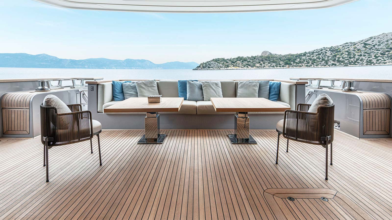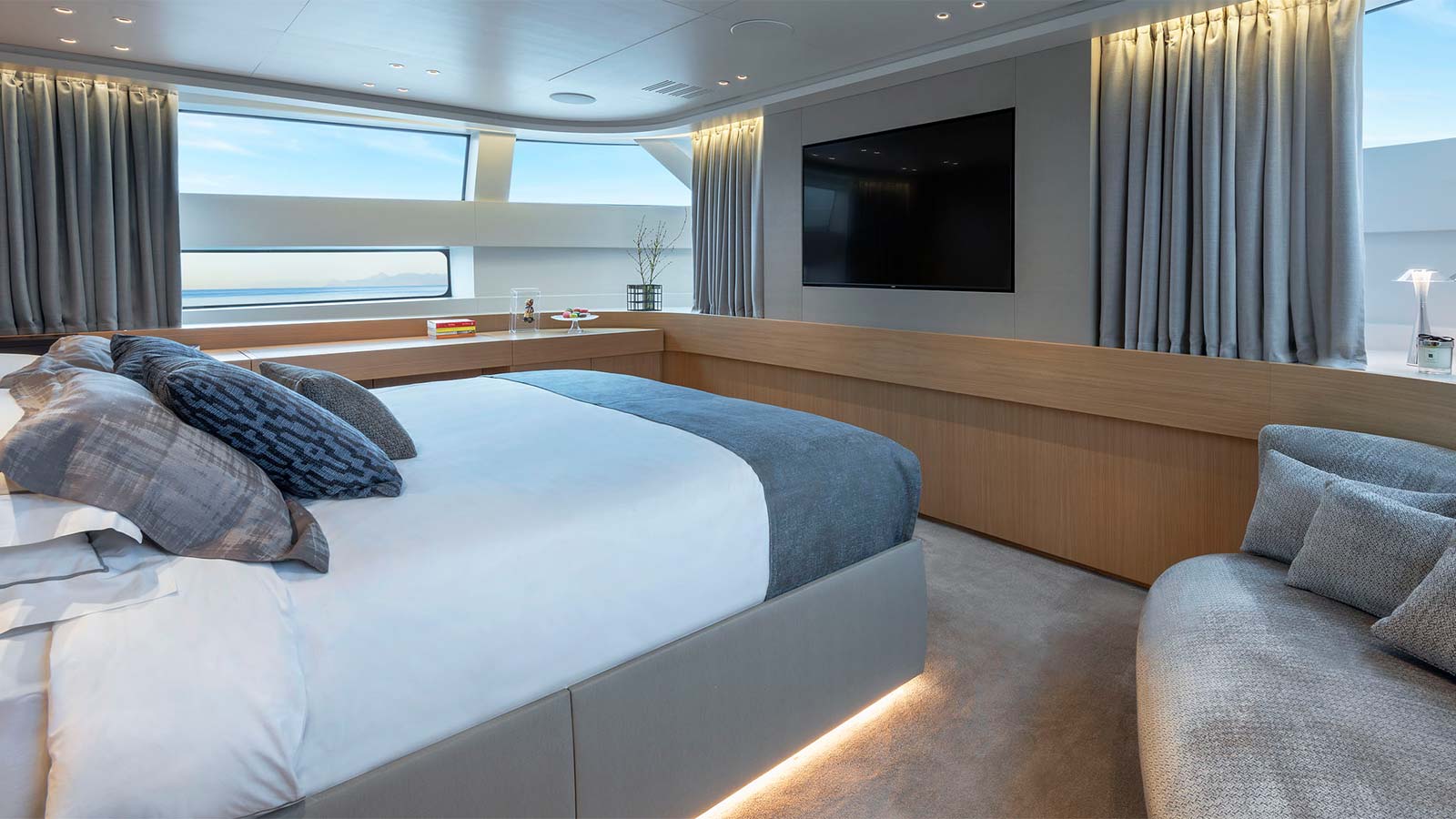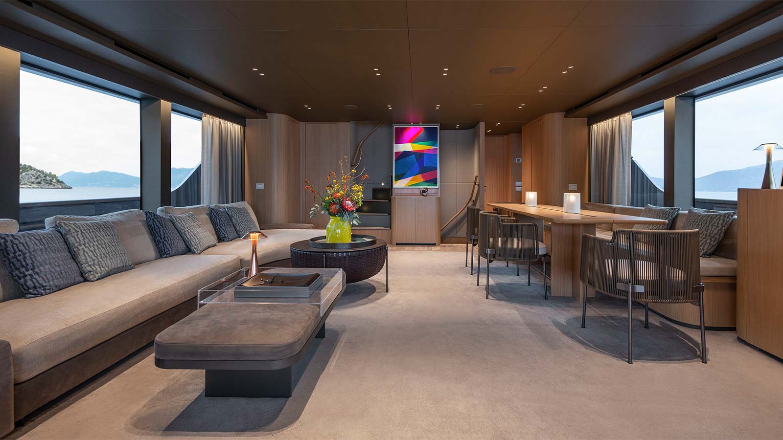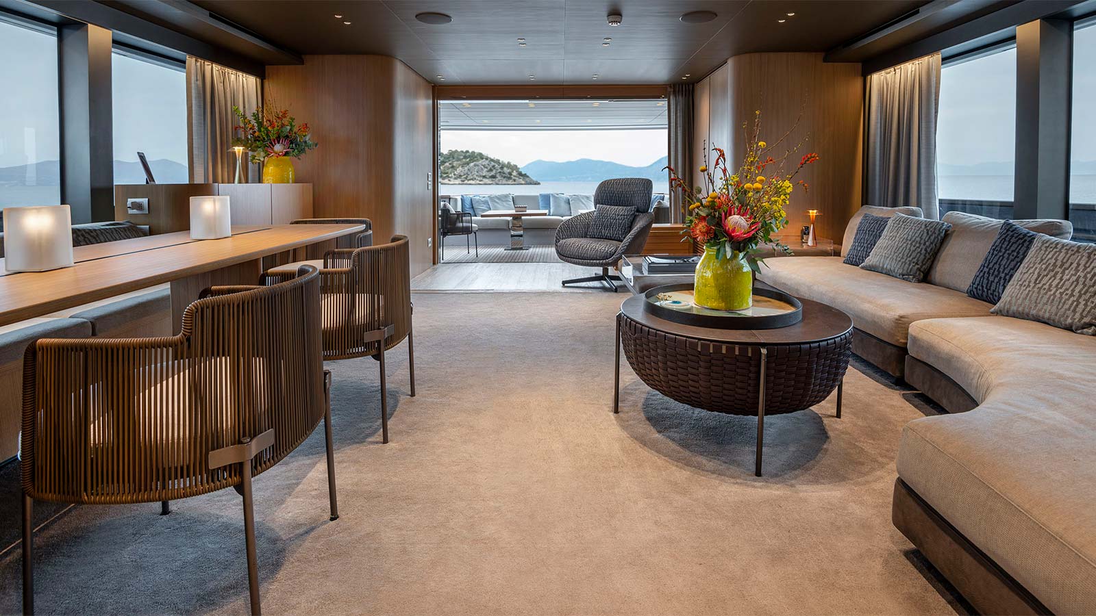 'Fatsa' by the Italian shipyard Sanlorenzo offers flexible accommodation for up to 10 guests in 5 suites comprising a master suite, one VIP cabin, one double cabin and two twin cabins. There are 7 beds in total, including 1 king, 2 queen and 4 singles. She is also capable of carrying up to 5 crew onboard to ensure a relaxed luxury yacht charter experience. The sky lounge is the ultimate place to unwind as the ceiling to floor glass balcony door on the portside of the yacht completely opens, sliding to the side revealing the scenic view. The balcony doors of the sky lounge aft also completely fold back, creating a vast area of the interior area connected to the exterior.