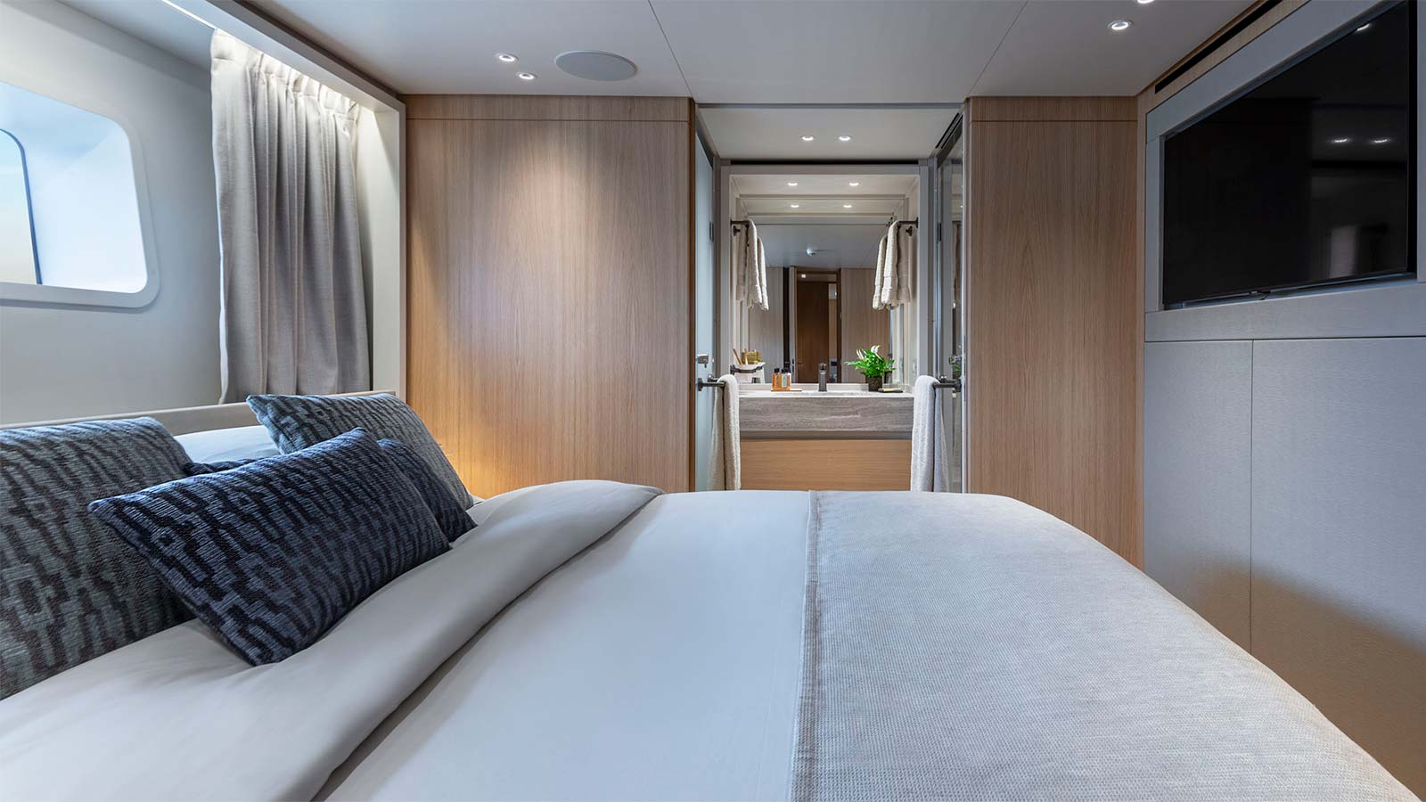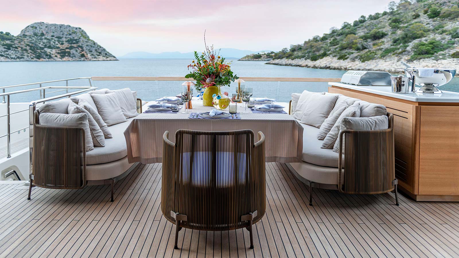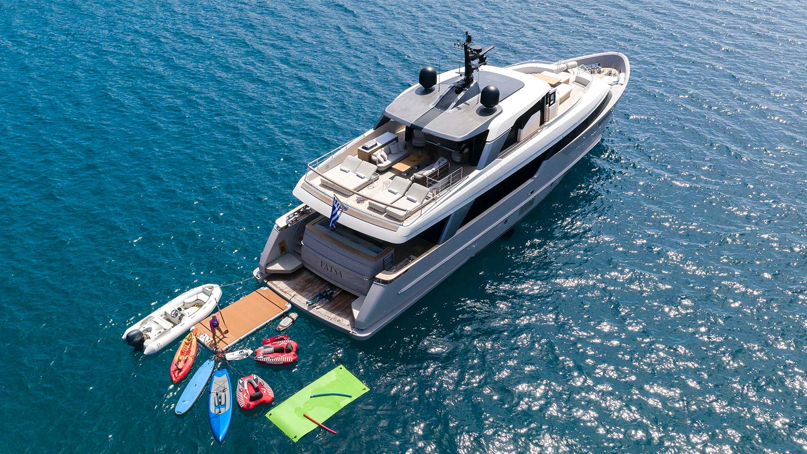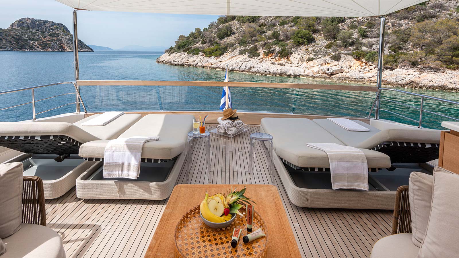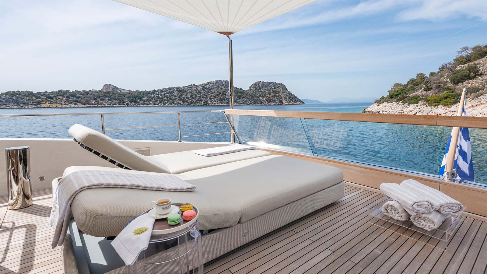 'Fatsa' by the Italian shipyard Sanlorenzo offers flexible accommodation for up to 10 guests in 5 suites comprising a master suite, one VIP cabin, one double cabin and two twin cabins. There are 7 beds in total, including 1 king, 2 queen and 4 singles. She is also capable of carrying up to 5 crew onboard to ensure a relaxed luxury yacht charter experience. The sky lounge is the ultimate place to unwind as the ceiling to floor glass balcony door on the portside of the yacht completely opens, sliding to the side revealing the scenic view. The balcony doors of the sky lounge aft also completely fold back, creating a vast area of the interior area connected to the exterior.