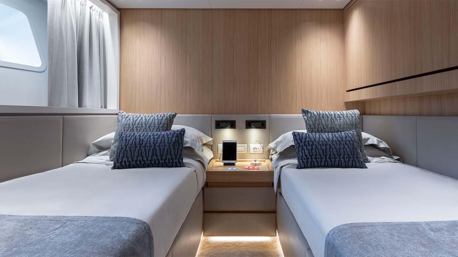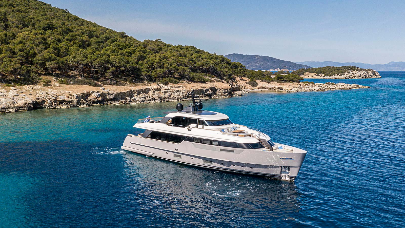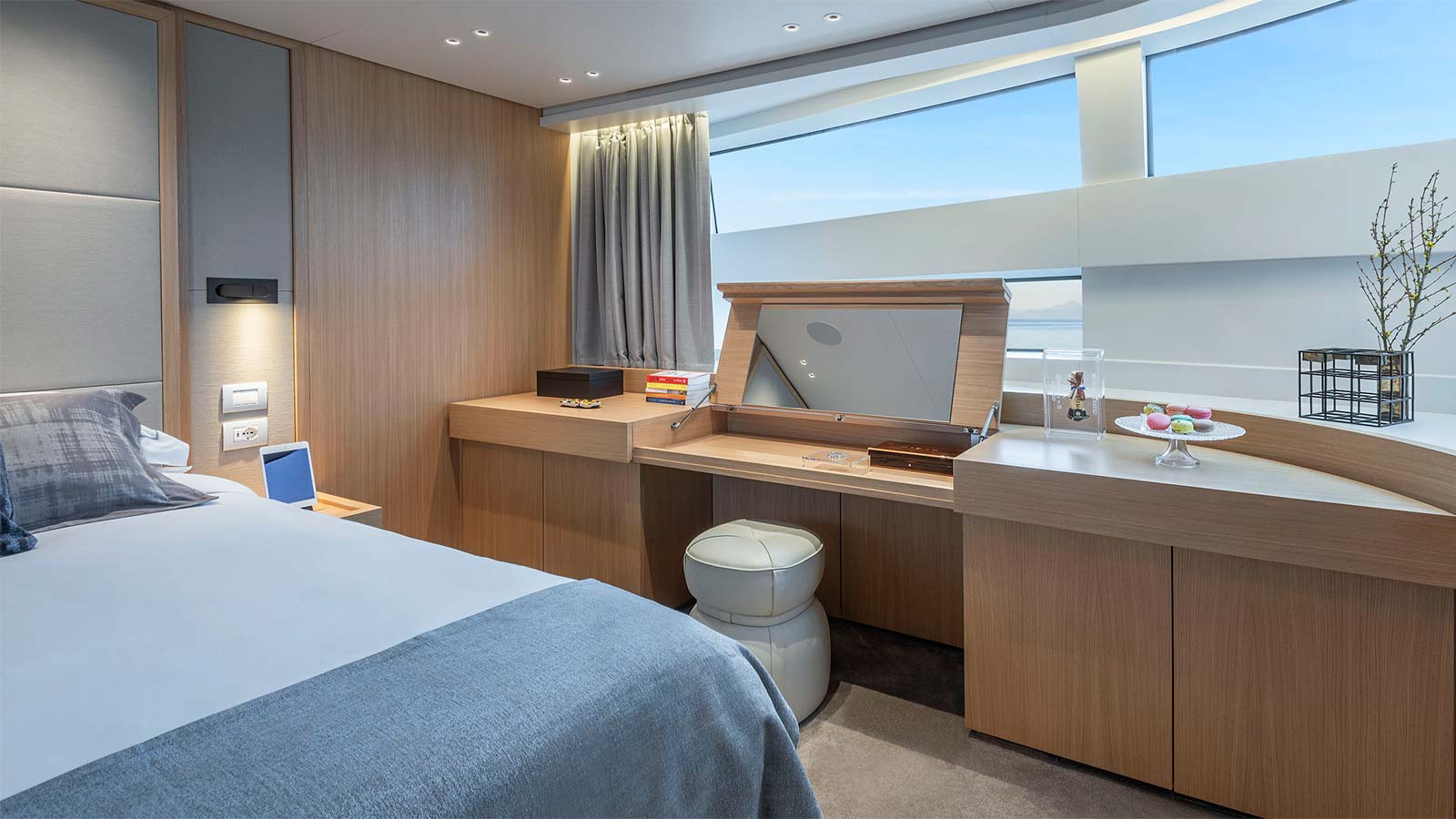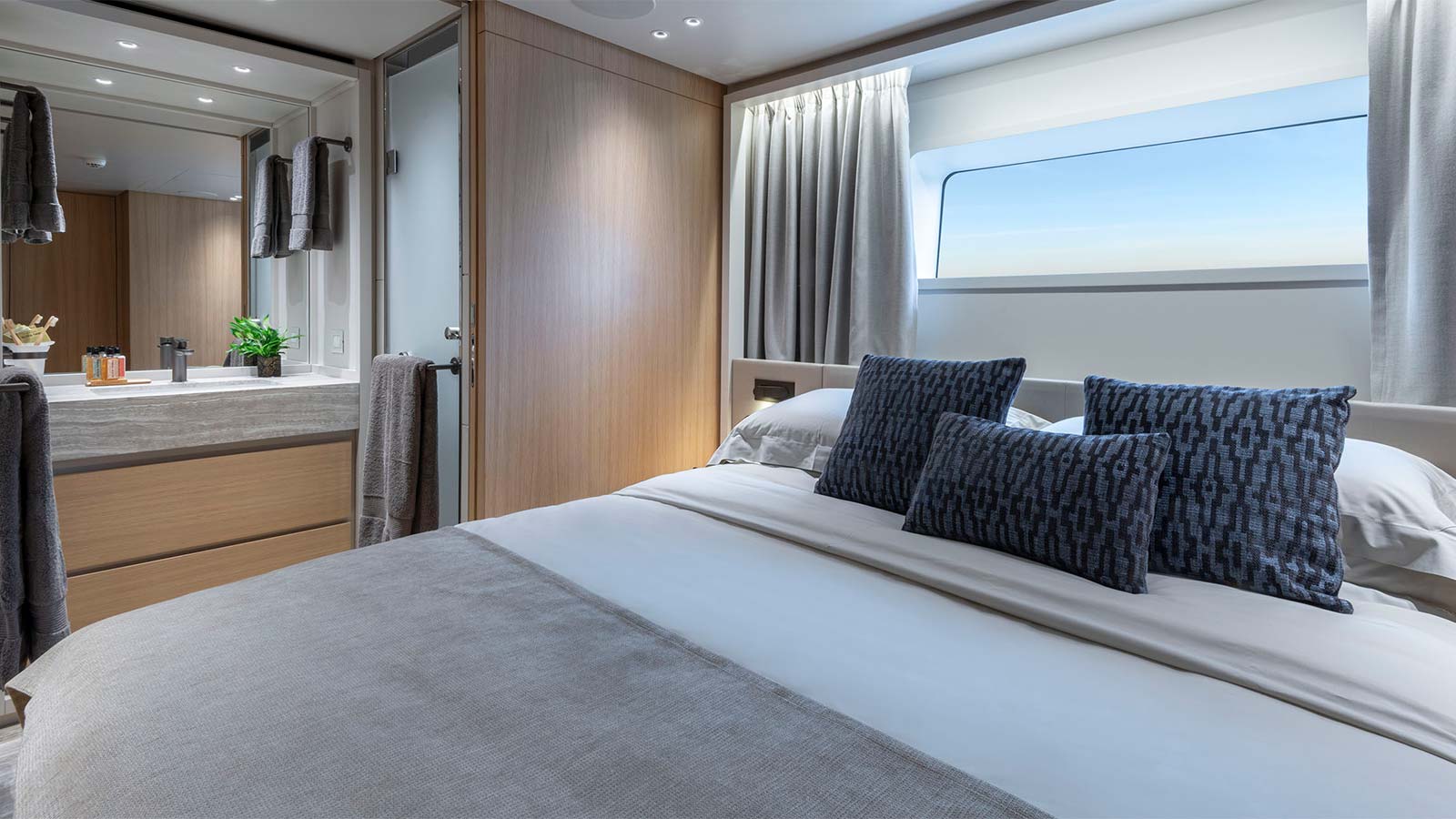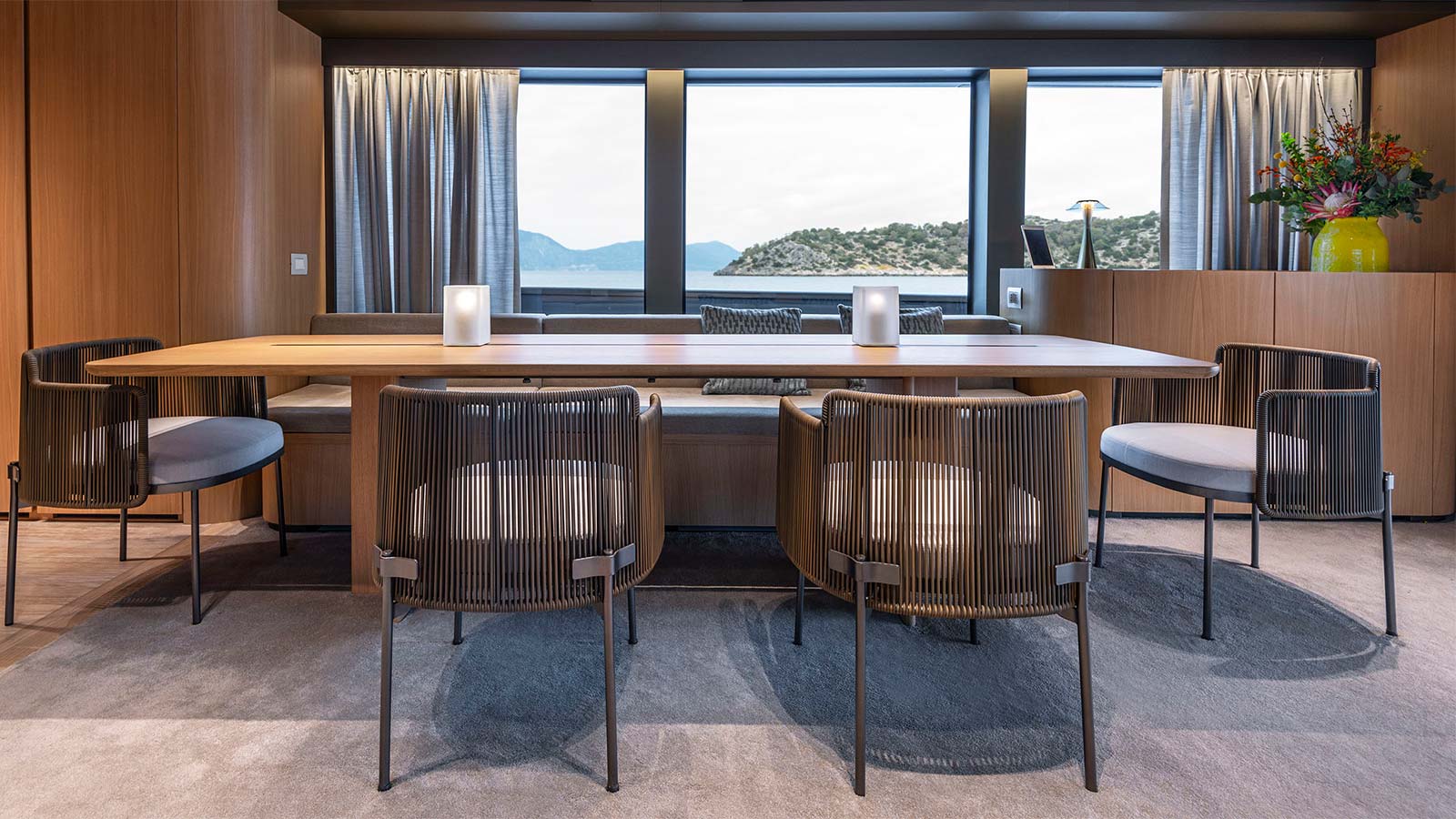 'Fatsa' by the Italian shipyard Sanlorenzo offers flexible accommodation for up to 10 guests in 5 suites comprising a master suite, one VIP cabin, one double cabin and two twin cabins. There are 7 beds in total, including 1 king, 2 queen and 4 singles. She is also capable of carrying up to 5 crew onboard to ensure a relaxed luxury yacht charter experience. The sky lounge is the ultimate place to unwind as the ceiling to floor glass balcony door on the portside of the yacht completely opens, sliding to the side revealing the scenic view. The balcony doors of the sky lounge aft also completely fold back, creating a vast area of the interior area connected to the exterior.