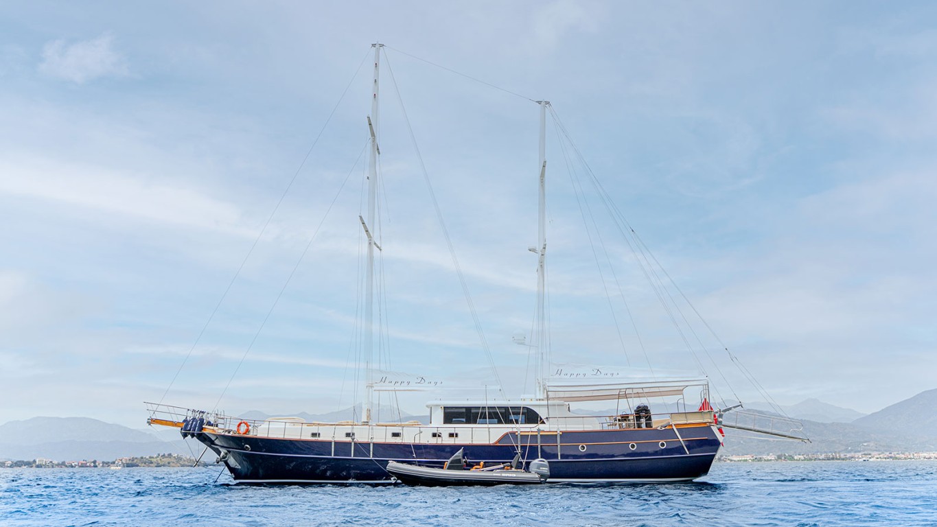 Refitted in 2021, 'Happy Days' is a spacious motor-sailer with a classic exterior look and modern interior. 10 guests can comfortably be accommodated in 5 cabins which include 2 masters, 1 double and 2 twins. The aft master with its’ panoramic sea view is particularly romantic. All cabins are en-suite and with 24 hour air-conditioning. The aft deck hosts full beam wide lounging cushions, a dining table that can easily seat 10 guests and a fully stocked bar for speedy service. On the forward deck there is ample space with sunbathing mattresses for all guests and a seating area with two sunset cocktail tables. 'Happy Days' far more powerful compared to other vessels of her size, allowing for fantastic water sport experience. A professional crew of 5 are onboard to offer service with famous Turkish hospitality for an unforgettable vacation.