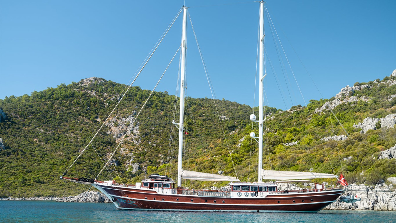 Built in 2004 by Ozturhan Yachts and refitted in 2019, luxury sailing yacht 'Kaptan Kadir' boasts a solid mahogany hull. She offers guest accommodation for up to 12 guests in 6 suites comprising a master suite, two VIP cabins and two twin cabins. There are 8 beds in total, including 2 king, 2 queen and 4 singles. She is also capable of carrying up to 6 crew onboard to ensure a relaxed luxury yacht charter experience.The roof of the main cabin house doubles as a sun deck where a selection of comfortable sun pads can be arranged to make the most of the all day sun. On the foredeck the built-in crescent seating area is adjacent to the fabulous deck jacuzzi spa and full-beam forward sun pads. The raised cabin house hosts the main salon, giving the space expansive views and plenty of natural light. The interior crew will create beautiful table settings. 'Kaptan Kadir' is a unique gulet yacht and the ideal platform for an adventure charter that will guarantee unforgettable memories.