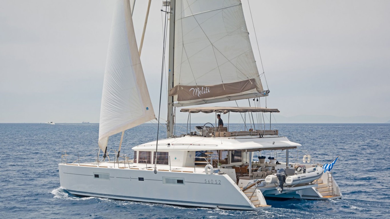 Meliti is a superb Lagoon 560 sailing catamaran available for your next luxury charter in Greece. She has several leisure spaces for relaxing or entertaining in comfort and style including a large flybridge, aft deck and forward seating and sunpads. Meliti's saloon is a welcoming and spacious area full of light thanks to her huge panoramic windows. She accommodates 10 guests with 4 double bed cabins and 1 bunk bed cabin making her ideal for groups of family or friends to explore the stunning Greek Islands.