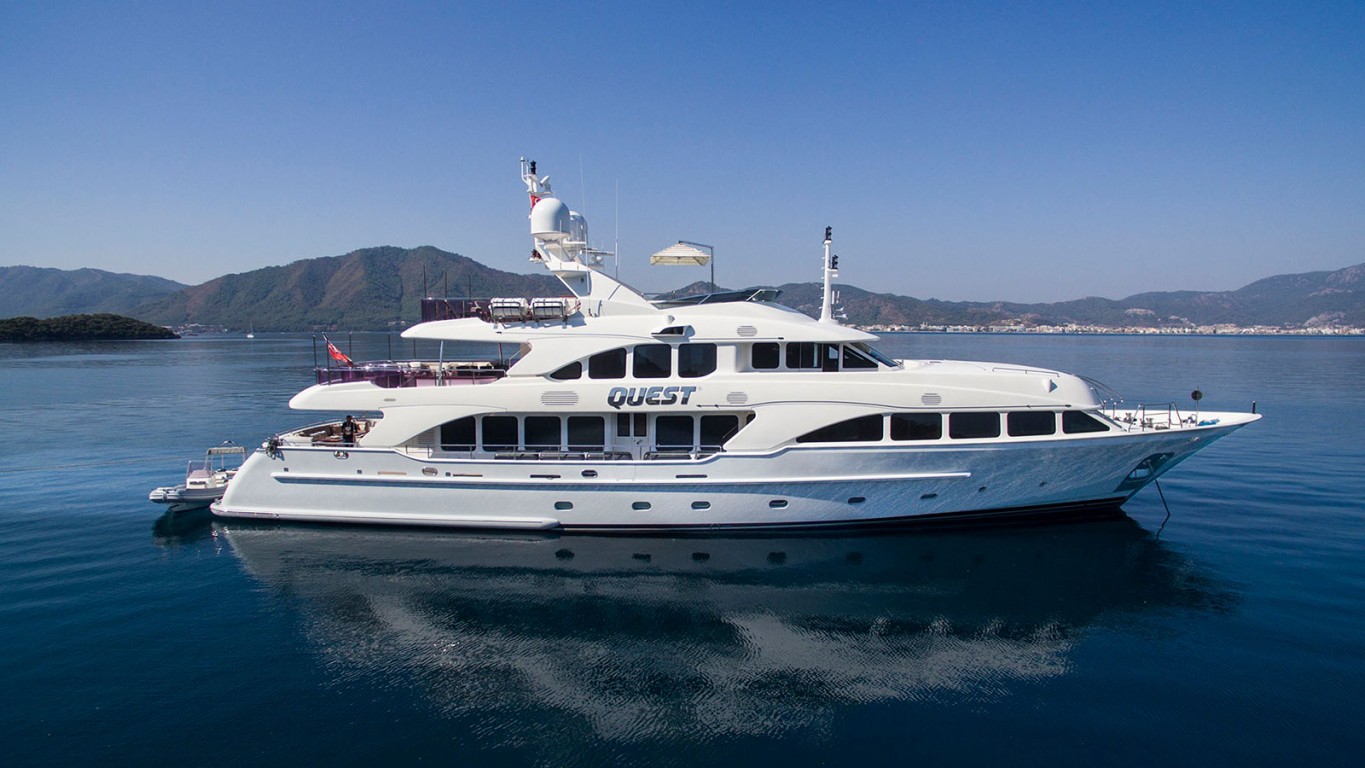 The 36.6m (120ft) motor yacht 'Quest R' is a stunning blend of contemporary design and classic elegance, offering an exceptional charter experience on the water. Built by Benetti and refitted to perfection, 'Quest R' is renowned for her spacious layout, luxurious finishes, and first-class service. She accommodates up to 12 guests in five beautifully appointed cabins, including a full-beam master suite on the main deck, two VIP staterooms, and two twin cabins with Pullman berths—ideal for families or groups of friends. Her elegant interior features warm woods, plush furnishings, and an inviting ambiance throughout. On deck, 'Quest R' offers expansive outdoor living spaces, perfect for dining al fresco, sunbathing, or simply enjoying panoramic ocean views. A Jacuzzi on the sun deck, a range of water toys including jet skis, paddleboards, and snorkelling gear, as well as a beach club, ensure endless entertainment. With a dedicated crew of 7 delivering impeccable service, 'Quest R' provides the perfect balance of relaxation, adventure, and refined luxury.