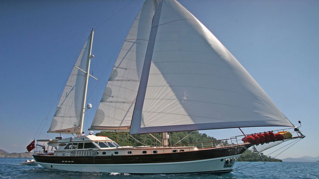 "Serenity 86" is a sleek and modern motor sailer that was launched in 2007 and has been well maintained to remain in brand new condition. Her light colour wooden interior finish is supported by spa like white bathrooms to provide a very airy and soothing ambience. With a very comfortable aft dining area, bimini covered forward deck and a flybridge that can easily sit eight guests, this vessel offers no less exterior space than one would find in motor yachts along the 30m range. The yacht is equipped with all the modern amenities and games as well as a generous range of water sports. "Serenity 86" is also a great option for guests who like to open sails to enjoy quiet crossings and take in the views.