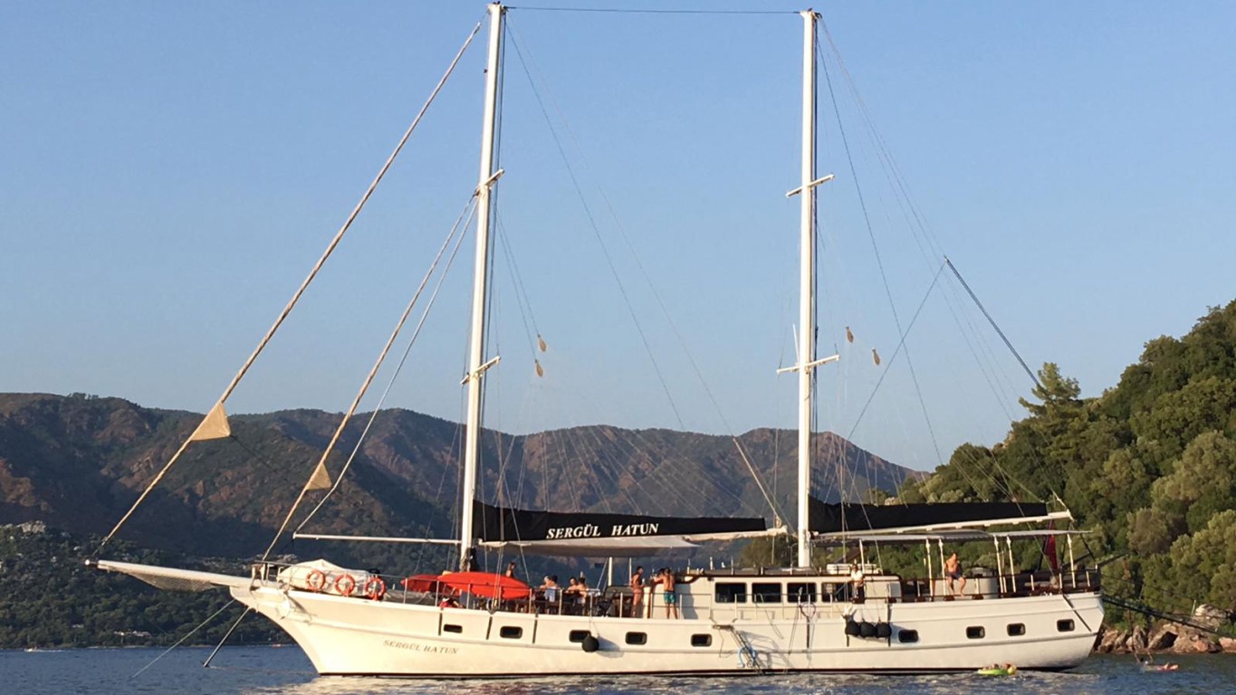 Simerenya (ex. Sergül Hatun) is a 30 meter traditional Turkish wooden gulet that is a very striking, comfortable and clean boat. Though luxurious, it is a great choice for all types of travellers as it can be chartered at a reasonable price compared to other yachts. This gulet offers accommodation for up to 18 guests in nine air conditioned cabins. The cabin layout includes six double bed cabins and two triple rooms. Each cabin is adorned with wardrobes, ensuite bathroom with an enclosed shower unit and hair dryer. The upper deck is unique with the main formal dining area at the front of the boat and the rear available for casual drinks and snacks. There is one main sun lounging area with comfortable sunbeds and an optional shade. In the saloon guests also have access to a plasma TV and music system.