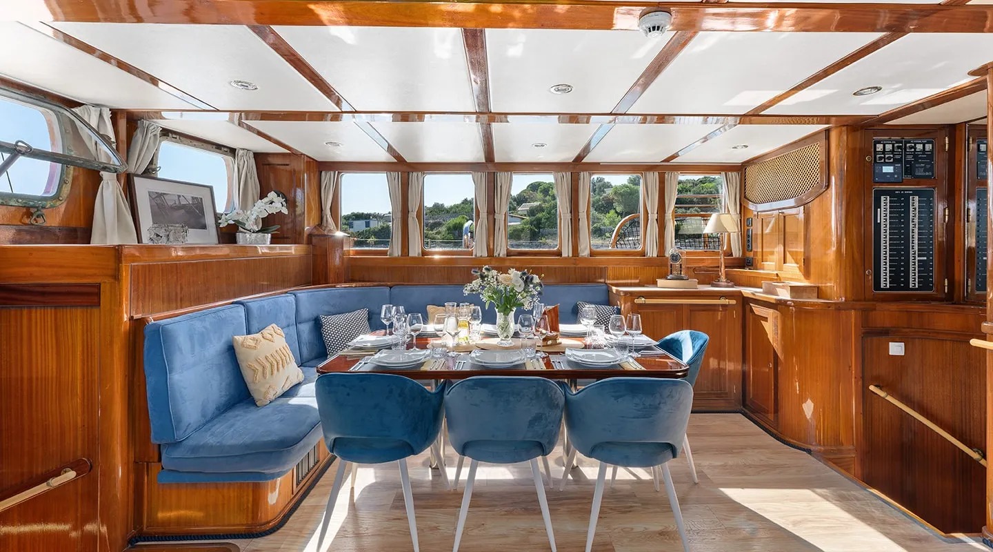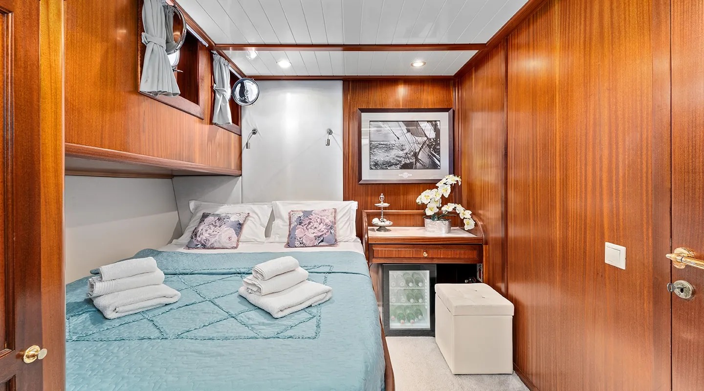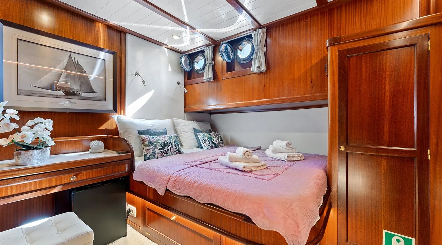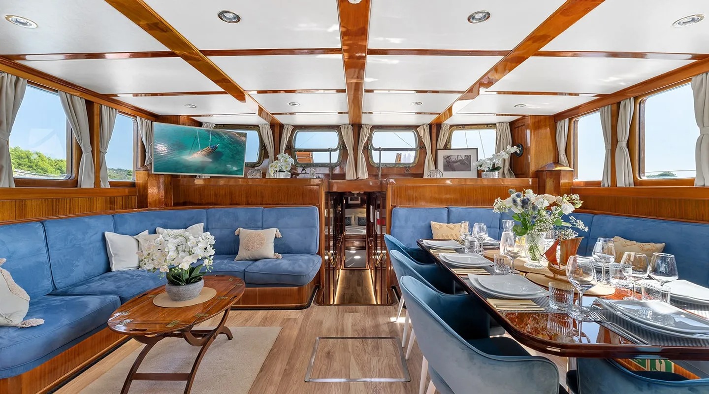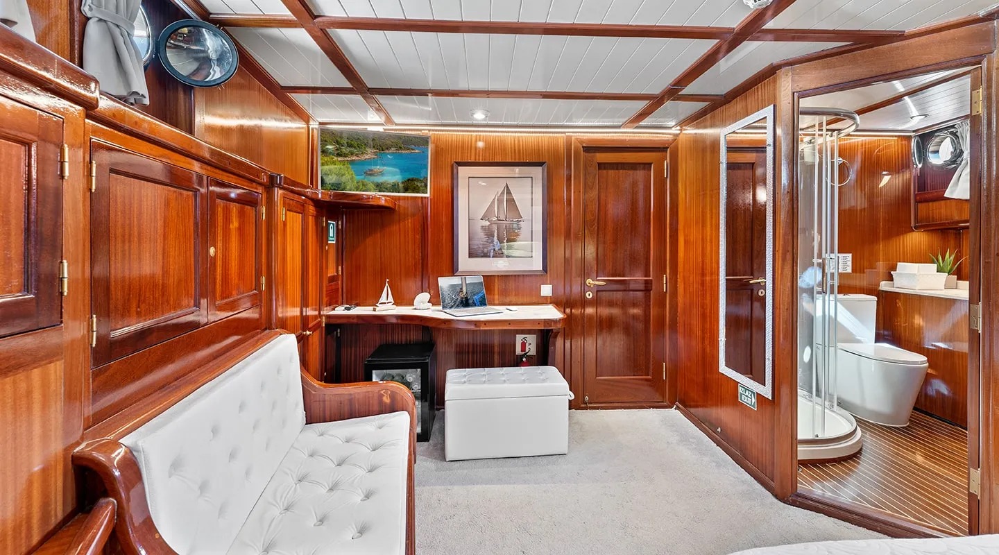 Sailing yacht 'Smart Spirit 1' has a tasteful traditional décor boasting fine mahogany panels, elegant soft furnishings and classy fittings. The salon and dining area in the raised deckhouse offer optimum views and ample natural light. It is the ideal social point with a formal dining table, lounge seating and TV entertainment. Forward of the salon there are the guest cabins.