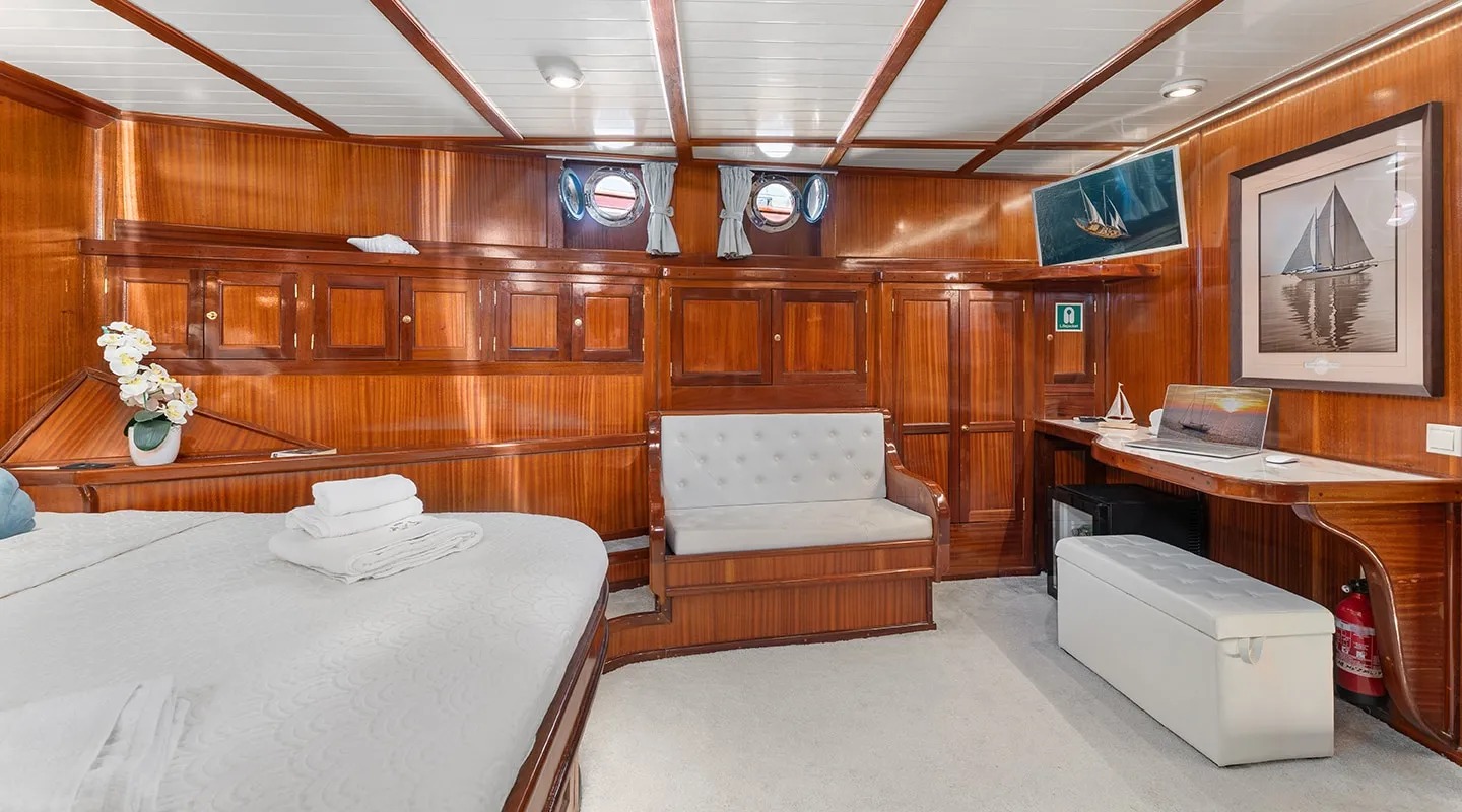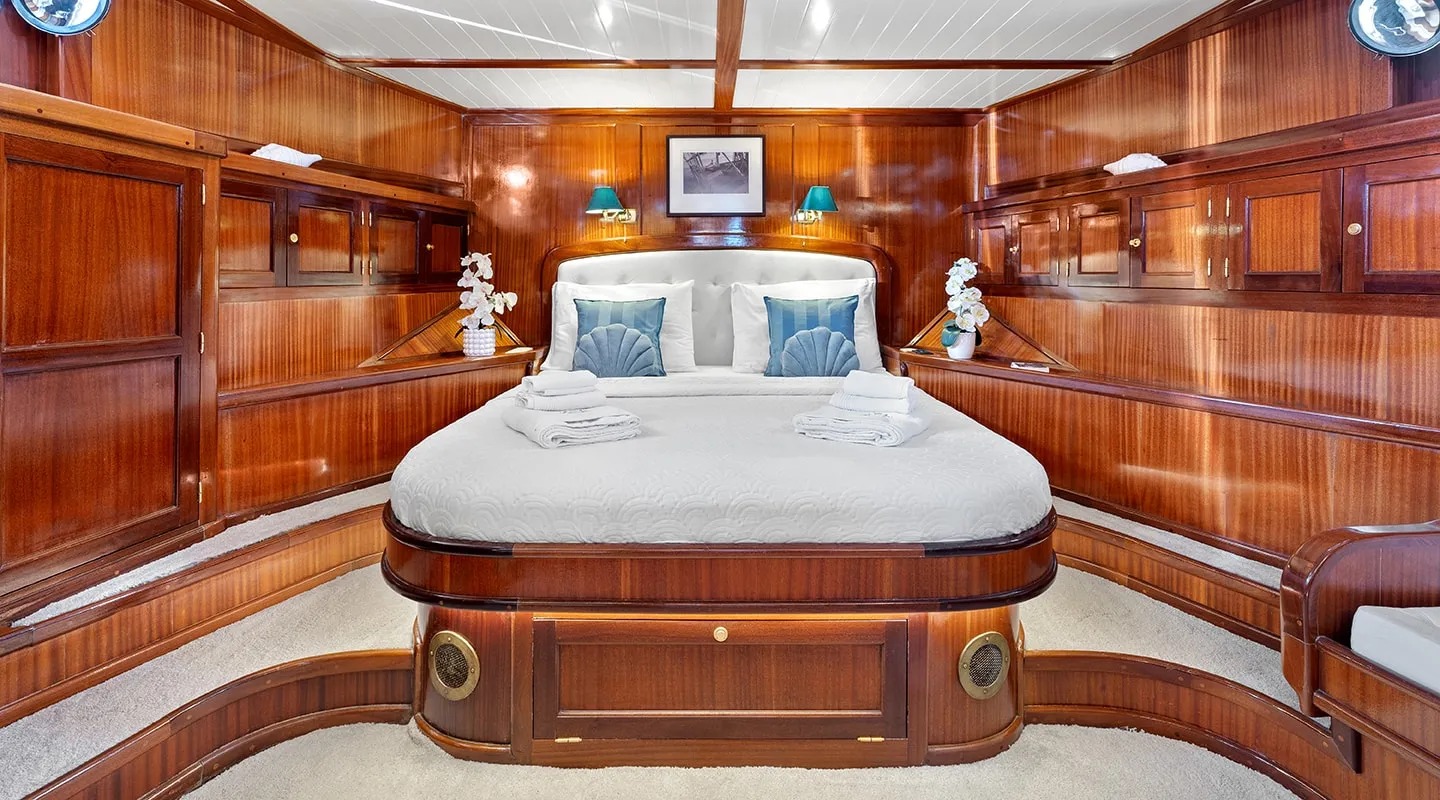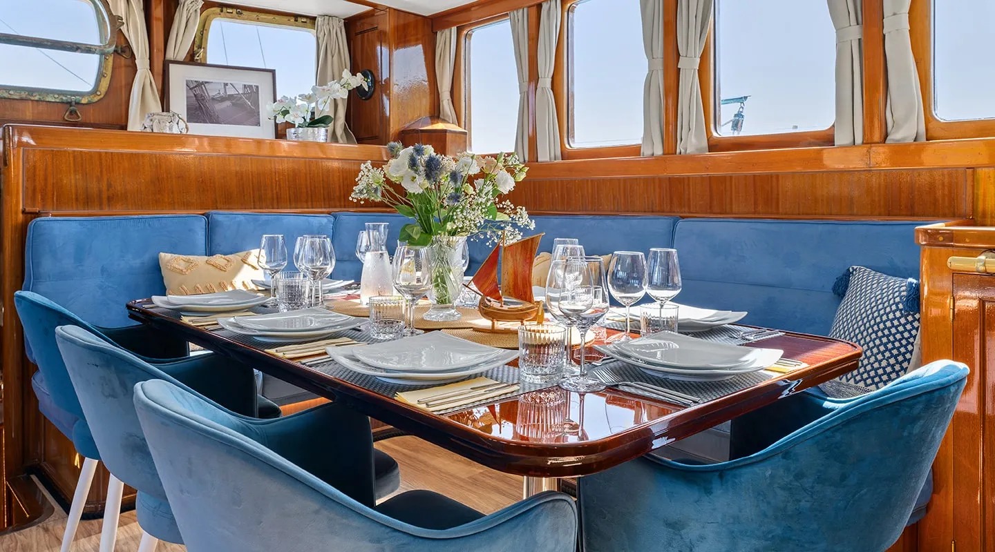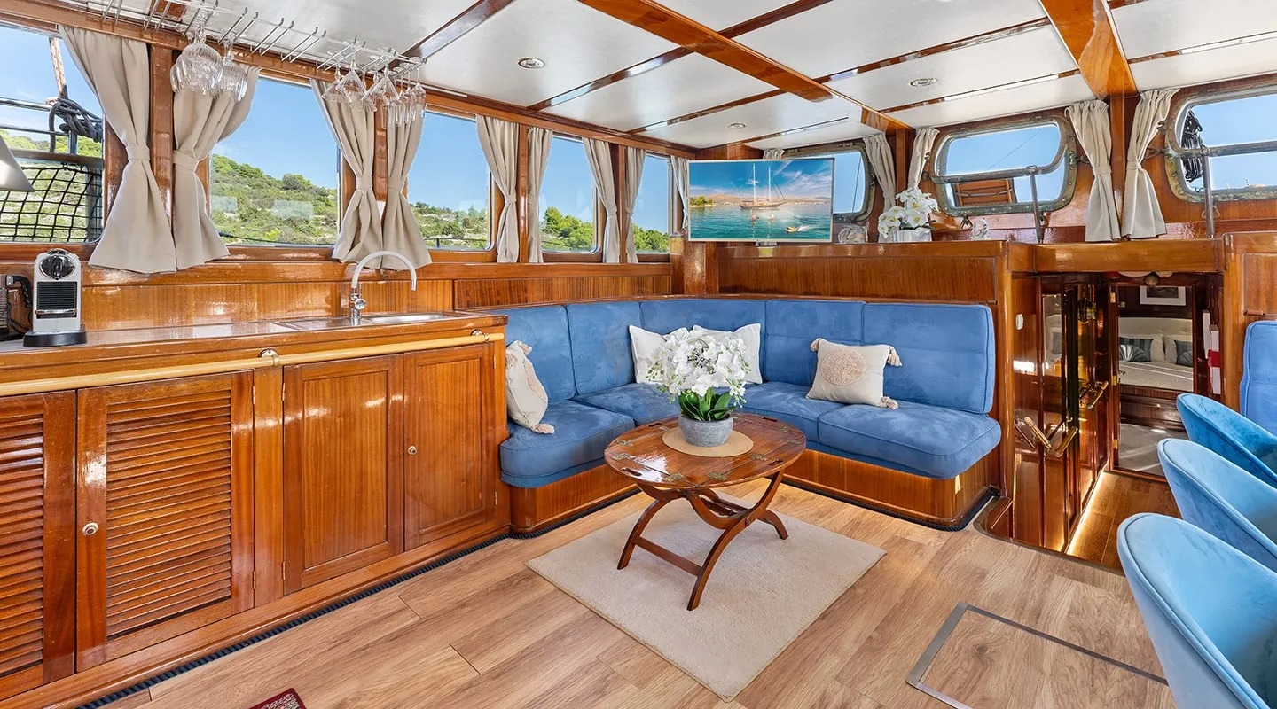 Sailing yacht 'Smart Spirit 1' has a tasteful traditional décor boasting fine mahogany panels, elegant soft furnishings and classy fittings. The salon and dining area in the raised deckhouse offer optimum views and ample natural light. It is the ideal social point with a formal dining table, lounge seating and TV entertainment. Forward of the salon there are the guest cabins.