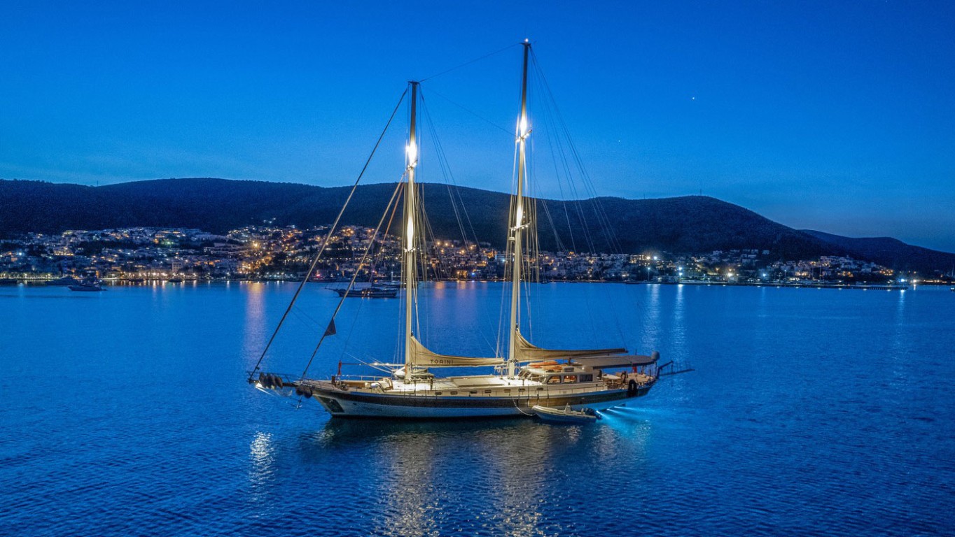 'Torini' gulet has changed her owner in 2023 and was renovated again in 2023 by Swiss Interior Design Studio K-interiors for who dream of a boat that can slide, feel and almost touch the water. This 30 meter luxury gulet impresses with the power of her nearly 500 m2 large sails capable of propelling more than 12 knots and seduces with the elegance of her slender, classic and restrained hull. 'Torini' gulet elevates the rule of traditional boating with its ottoman style while respecting the colors of nature, the nuances of the water that enliven the rocky dynamics. A bold gulet spirit aiming at the pure pleasure of sailing to let you be transported to idyllic places at the slow pace or in a frenzied rhythm.