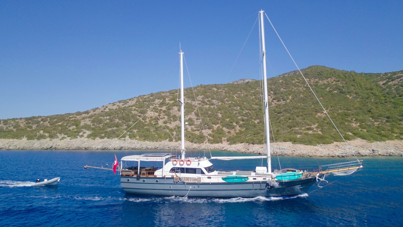 Gulet 'Vamos 1' is 28 meters long and completely renovated in 2021. She has been redesigned in order to increase the service quality and meet the expectations of the guests and serves with a carefully selected team of 4 crew. She has 4 Double, 2 Twin Cabins, thereby accommodating 12 guests, all in air-conditioned cabins. Each cabin has a separate WC and shower unit. There are a TV, DVD and music system in the saloon. There is a spacious cushioned seating area, dining table and dining area at the rear of the boat. There is a separate dining table in saloon and your meals are prepared in a fully equipped separate kitchen. There are separate cabins for the 4 crew accompanying you on your cruise. 'Vamos 1' Gulet has enough sunbathing mats and space for all guests.