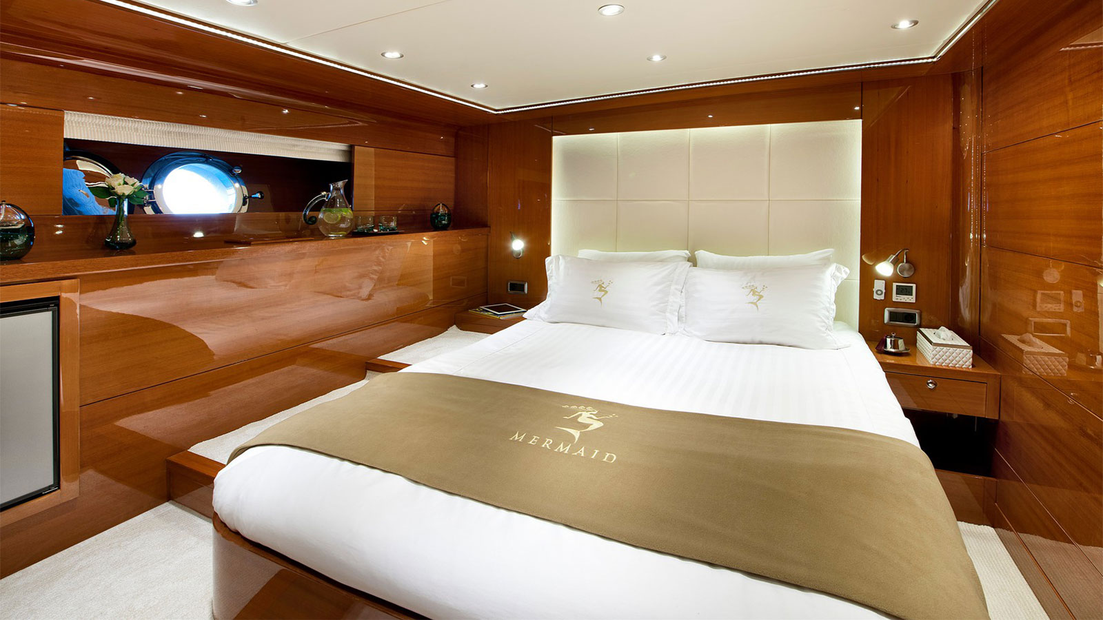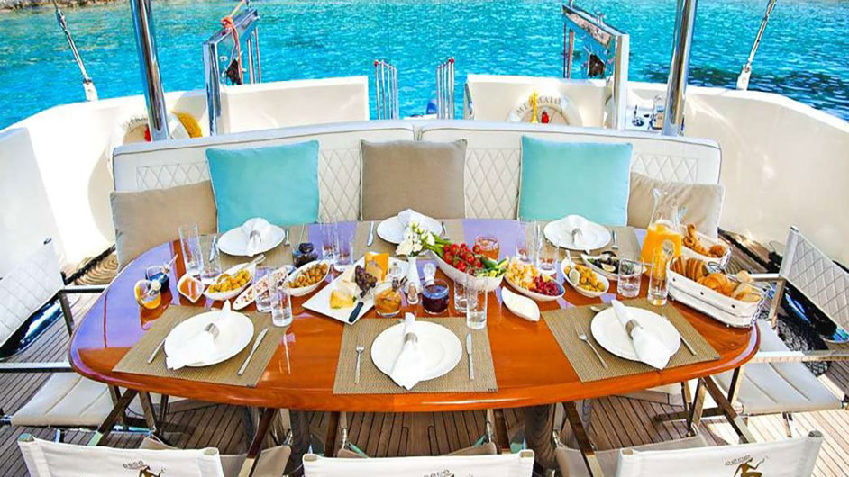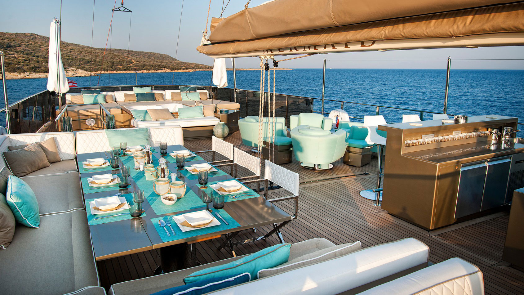 She is a stunning, 34m Custom Motor Sailer built by Cavusoglu Shipyard. With 5 cabins for up to 10 guests, huge volume, vast sundeck, commercial registration and extensive 2017 & 2020 refits. She offers phenomenal ownership versatility and provides a wonderful platform, as both a family yacht, or self-sufficient charter business. Her sundeck with an ingenious combination of highly adaptable and flexible custom-engineered systems can be converted from a daytime lounge into a night-time buffet set-up and a sumptuous table that seats up to 14 guests, ready to host the party of a lifetime. The vast sundeck area flaunts a professionally equipped bar, a spacious lounge, comfy, rotating armchairs and central whirlpool spa surrounded by an enticing expanse of sunbeds.
