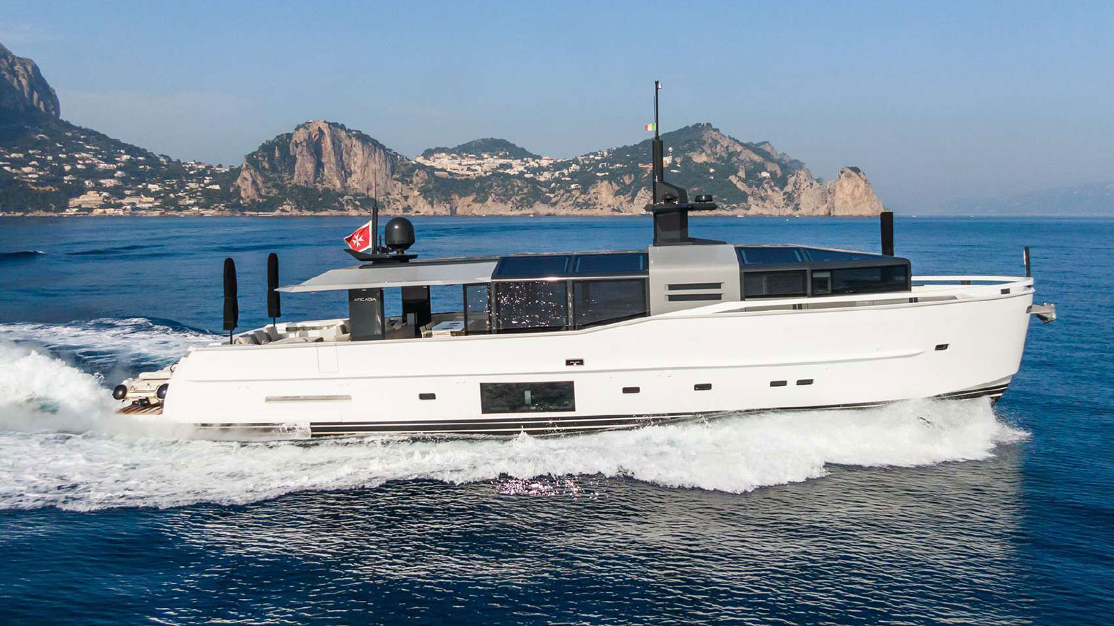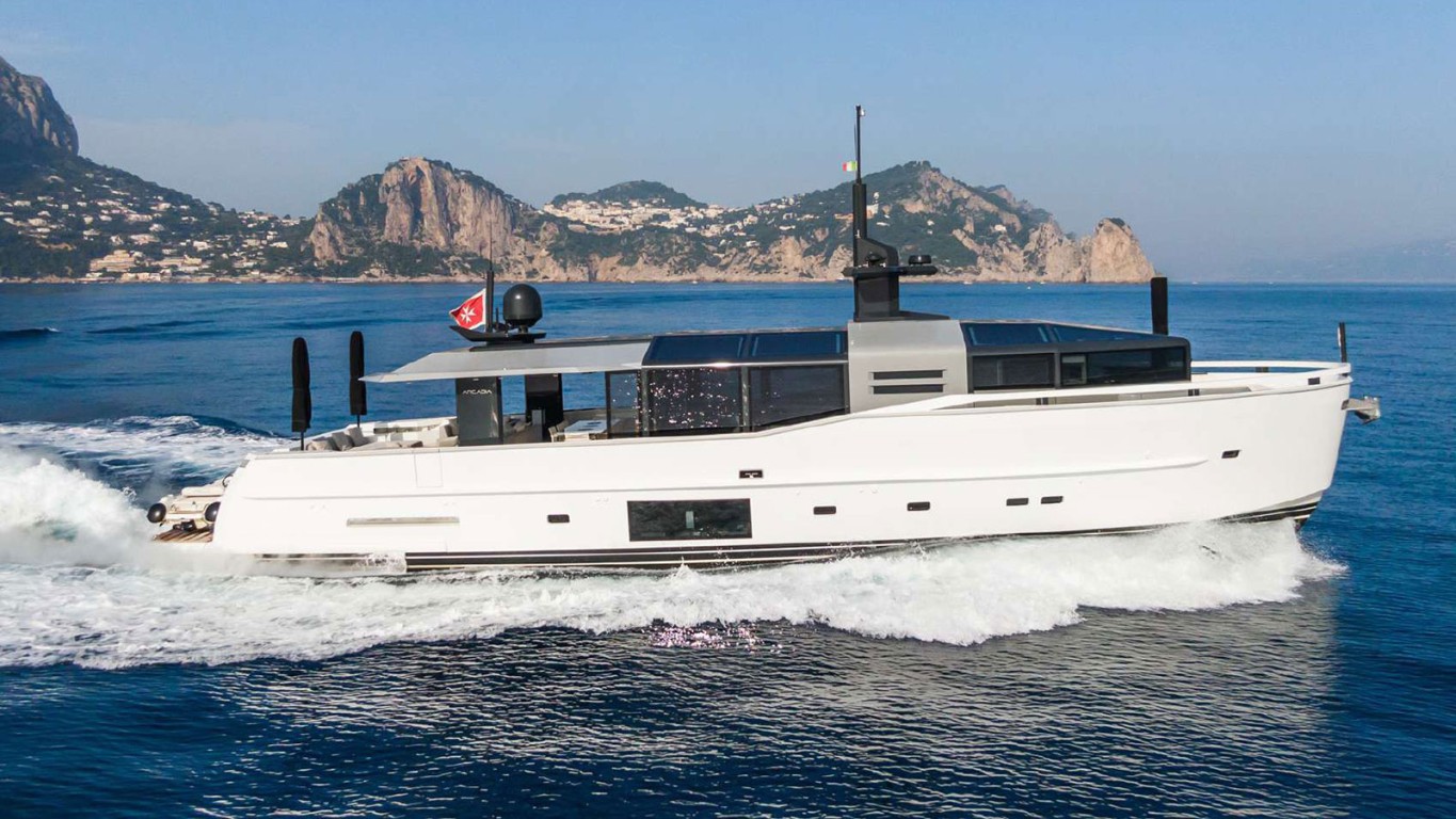 The Arcadia A85 is a 26-meter motor yacht that perfectly balances Italian elegance with reliable performance. Built in 2019 with a sleek fiberglass displacement hull, she ensures smooth and comfortable cruising. Powered by twin MAN i6 730 hp diesel engines, she offers a cruising speed of 10 knots and can reach up to 16 knots, ideal for relaxed Mediterranean voyages. Her loft-style layout features bright, open spaces and accommodates up to 8 guests across 4 well-appointed staterooms, while a professional crew of 4 provides the highest level of service. Maintained by the same crew since launch and used exclusively for private enjoyment, she remains in pristine condition with only 1,540 engine hours. With impressive range and numerous additional features, the Arcadia A85 is perfectly equipped for extended adventures at sea. She represents a unique opportunity to acquire a yacht that combines modern design, comfort, and outstanding upkeep.